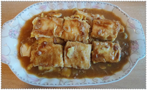 看到大家热火朝天不停上鲁菜,我也很眼馋。豆腐,做豆腐吧,锅塌豆腐,家中还有点肉末,那就来个肉末烩锅塌豆腐吧。跟这个鲁菜也算是沾点边吧。