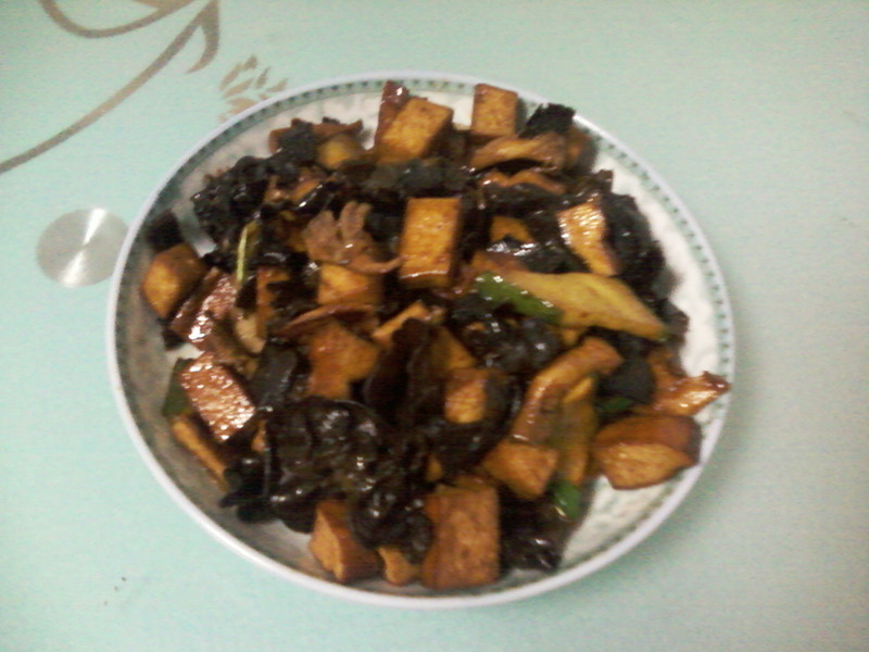 3、木耳泡发后和鸭腿菇一起焯水 捞出过凉水 控干备用,香干切丁过油煎至金黄后捞出备用,黄瓜不用多切菱形片 切点葱圈 ,热锅凉油稍加热后,放入葱花10秒后,放焯过水后的鸭腿菇和木耳翻炒到一点点醋,放香干和黄瓜 放酱油 甜面酱 翻炒 放盐 鸡精即可。