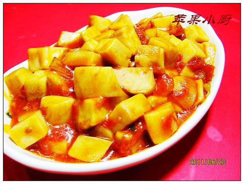 茄汁菜,在鲁菜中也有不少运用。这道菜,口味酸甜香咸,色泽红亮,味道香浓,非常具有鲁菜之特点。