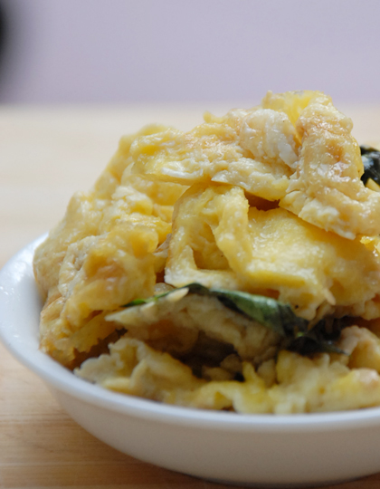 5、蛋液快要凝固的时候放九层塔。