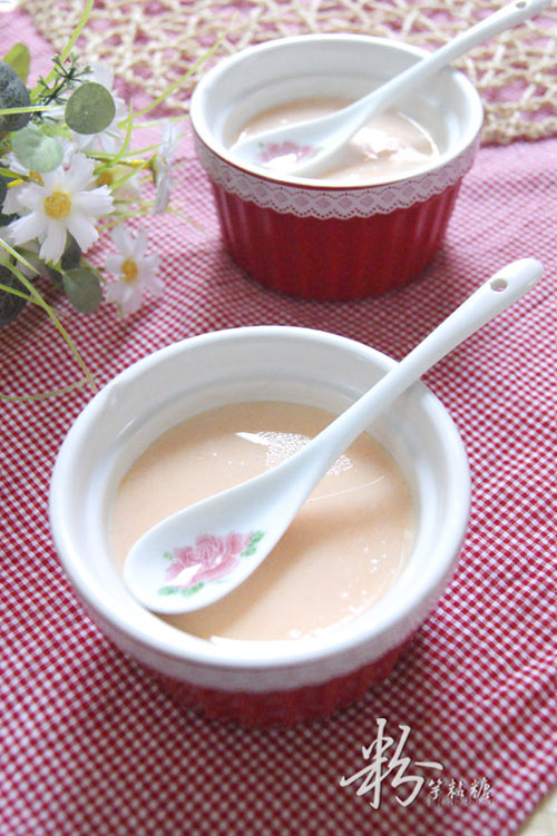 2、这款甜品可用鲜牛奶和奶粉来制作,鲜奶要先将牛奶加煮至微开再与木瓜液混合;而奶粉可放入木瓜汁里用热水冲泡。