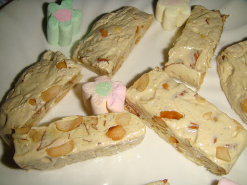 及以下步骤:准备的材料。 把杏仁切小粒和花生仁混合。 准备的材料。 把杏仁切小粒和花生仁混合。 准备的材料。 把杏仁切小粒和花生仁混合。 棉花糖入微波炉半分钟,看见膨胀就可以了。 加入杏仁快速搅拌。 把搅拌好的糖放在保鲜膜上压平,放入冰箱冷冻。 把冷冻好的糖拿出切块即可。