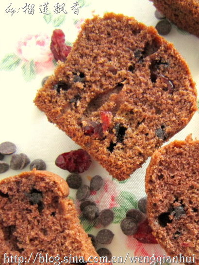 及以下步骤:烤箱预热,上下火180℃,中层,烤焙25分钟;烤好后放在烤网上晾凉即可。 尝尝吧,灰常不错滴。 准备材料;粉类全部混合在一起,过筛两次备用;黄油室温软化;全蛋打散(鸡蛋最好室温);蔓越莓干与红酒混合,浸泡至软备用。 过筛的粉类材料+盐+牛奶+软化的黄油,放入一个深一些的容器中。 用打蛋器慢速搅拌至黄油完全被吸收,面糊颜色变浅,而且质地比较膨松(中间停几次,用橡皮刮刀把容器边缘刮干净,以便所有材料都能充分搅拌)。 蛋液分3~4次加入,用打蛋器慢速搅拌至蛋液完全吸收,再加下一次;蛋液完全加入并且吸收后,继续以慢速搅拌至面糊呈柔软的细滑状。 加入浸泡好的蔓越莓干和烘焙用耐高温巧克力豆,用橡皮刮刀搅拌均匀。 用勺子把面糊挖入小纸杯中,或把面糊装入裱花袋挤入模具中,约7、8分满。 烤箱预热,上下火180℃,中层,烤焙25分钟;烤好后放在烤网上晾凉即可。 尝尝吧,灰常不错滴。