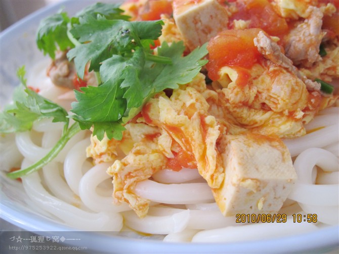 及以下步骤:锅内热油,五成热下入鸡蛋用锅铲迅速划散,待一凝固后即盛起备用。 将鸡蛋打入碗中,加盐,用筷子充分搅打均匀待用。豆腐切成小块,番茄切片。 锅内热油,五成热下入鸡蛋用锅铲迅速划散,待一凝固后即盛起备用。 将鸡蛋打入碗中,加盐,用筷子充分搅打均匀待用。豆腐切成小块,番茄切片。 锅内热油,五成热下入鸡蛋用锅铲迅速划散,待一凝固后即盛起备用。 将鸡蛋打入碗中,加盐,用筷子充分搅打均匀待用。豆腐切成小块,番茄切片。 锅内热油,五成热下入鸡蛋用锅铲迅速划散,待一凝固后即盛起备用。 锅中加水,加点盐,将乌冬面以沸水拌煮3分钟后,沥干水分装盘。 锅内热油,把番茄放进去翻炒一小会,加少水,炒好的鸡蛋,豆腐,猪肉片,撒点糖,炒均。大约4分钟,关火,撒入葱花。 把炒好的番茄蛋淋在乌冬面上。很简单的一道菜,你可以试着做下,味道还是很不错