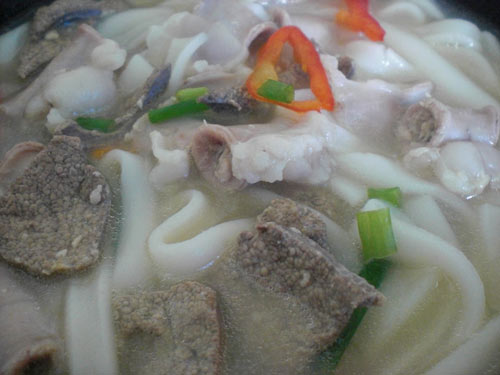 正宗的湛江汤粉,是加了各种各样的猪杂,包括猪心,猪舌,粉肠,猪肝。每种材料切薄片,开水一烫后加入河汤煮开即好。猪杂原汁原味,嫩嫩的。个人喜欢吃老些的,所以煮了5分钟。