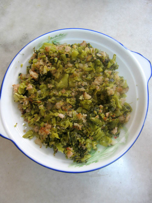 4、热锅,不放油,下酸菜微微炒干水后盛出。