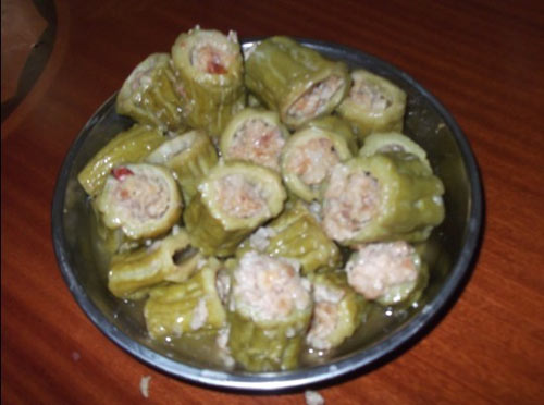 瓤 在广东菜 特别是客家菜是经常用到的菜市。 瓤豆腐。瓤茄子,瓤苦瓜,瓤灯笼椒,三样合在一起做为:煎瓤三宝。 瓤。。。特别是瓤苦瓜,煮的越绵越好,特别是隔餐吃更入味,更好吃,下饭。 这次是四姐做给我们吃的,我和睿去旅游途径四姐家,顺道去探望姐姐他们。