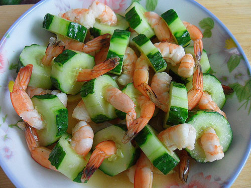 黄瓜不想吃太熟的话,可以先把虾摆盘之后,再加少量油加热之后把料汁烧下,之后淋在菜上面,也一样好吃的。