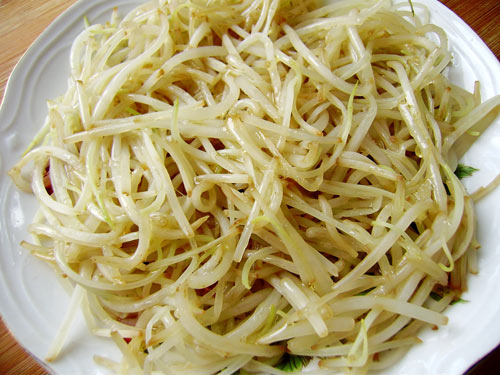 4、调拌均匀后,浇在绿豆芽上面,即可上桌食用了。