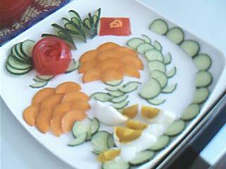 5、西红柿切成长方形,取皮去瓤,做成红旗样子。胡萝卜竖起来切个薄片,刻出镰刀斧头模样。这个镰刀斧头耗费我差不多半个小时,才搞出来。