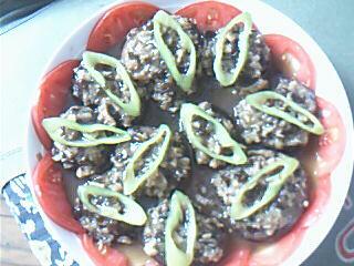 及以下步骤:鸡蛋打在小碗里,放一克盐,用打蛋器打碎搅匀。 热锅凉油,有可以稍微多一点,摊鸡蛋。 茄子碎、木耳碎、炒鸡蛋也切碎,放在盆里。如果觉得不香就加一点小磨香油。 玉米粉40克放入盆中,顺时针搅拌均匀。这时候可以加味精、鸡精提味。我是不加的,我做菜从来不用带“精”的调味品。 把调味好的馅料酿进像小碗一样的香菇里。大火蒸12分钟。 青椒切斜片圈圈,蒸香菇会有一些汁水出来,用蒸香菇的汁水打个勾芡的汁,青椒丢进去翻炒几下。我在这里放了烧烤汁。 勾芡汁洒在每只酿香菇上面,青椒圈圈摆一下。 西红柿横向切半个,再竖起来切半月形的片片,摆在酿香菇周围。 勾芡汁洒在每只酿香菇上面,青椒圈圈摆一下。 西红柿横向切半个,再竖起来切半月形的片片,摆在酿香菇周围。