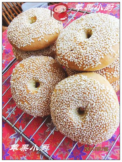 及以下步骤:将面粉、酵母、苏打、盐、水混合成光滑面团,醒发。 醒发好的面团分割成每个约70克的面团。 将面粉、酵母、苏打、盐、水混合成光滑面团,醒发。 醒发好的面团分割成每个约70克的面团。 将面粉、酵母、苏打、盐、水混合成光滑面团,醒发。 醒发好的面团分割成每个约70克的面团。 擀成厚约1厘米,直径大约7厘米的面饼。 中间穿一个洞。 刷上水,沾芝麻。 继续醒发一会,饼的厚度增至约2厘米时,入预热的烤箱,180度20分钟,或200度15分钟都可。