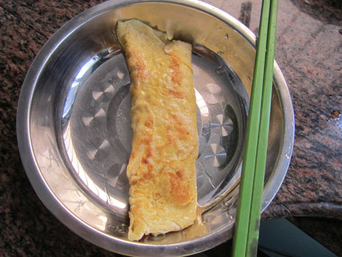 6、把蛋卷起来,这个步骤很简单,因为蛋有粘性,卷好之后,再煎一会,因为内部还没熟。