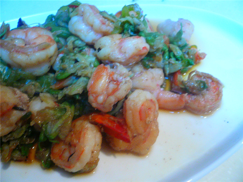 5、透着花香的一盘炒虾出锅了。