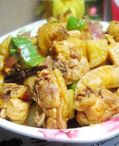 家里有半只鸡不知道该怎么吃,在网上搜了搜菜谱发现有个大盘鸡很是诱人,就按方法跟着做了,不过好像正宗的大盘鸡吃的时候要再煮一些面条进去的,但是我也没有煮,所以就取名叫家庭版大盘鸡吧~