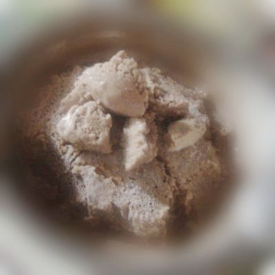 5、牛奶隔水加热融化可可粉。淡奶油打发