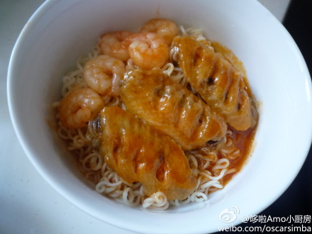 虾仁(适量) / 油(适量) / 番茄酱(适量) / 鸡翅(适量) / 方便面(适量)