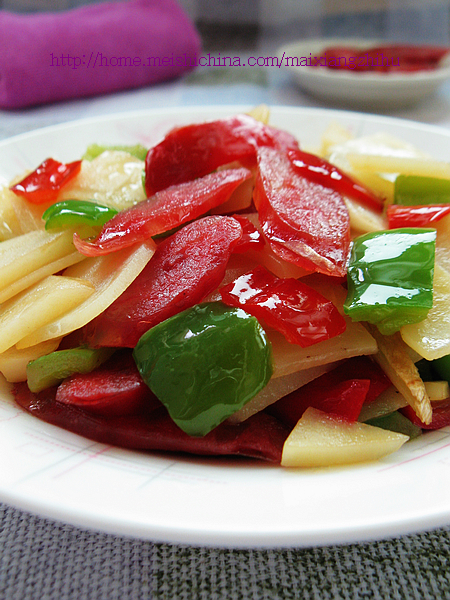 今天这道菜是香辣肠土豆片,味道很不错。用腊肠的油来炒菜,很滋润。加入了柿子椒和辣椒,辣辣的,很下饭。土豆片脆脆的,香极了。