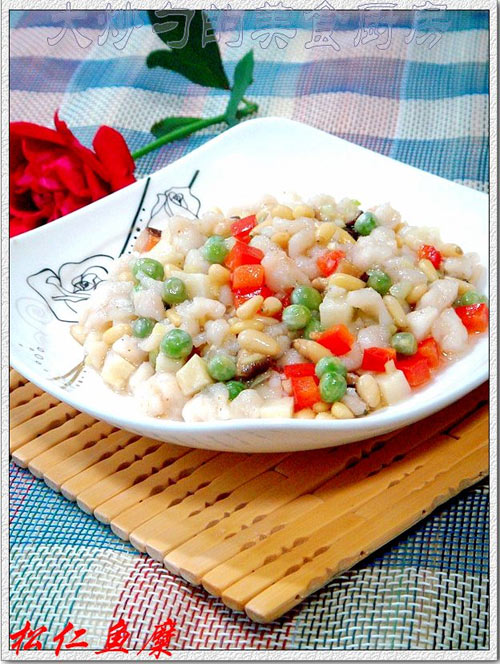 及以下步骤:汤锅水烧开把配料倒入焯水。 配料焯好水捞出备用。 炒勺上火烧热,注入凉油下入鱼糜滑散。 滑散后倒入所有配料炒匀。 倒入适量味汁芡水大火炒匀。 待芡汁糊化后,倒入熟松子仁翻炒均匀便可出锅。 出锅码盘便可上桌食用。操作完成。 倒入适量味汁芡水大火炒匀。 待芡汁糊化后,倒入熟松子仁翻炒均匀便可出锅。 出锅码盘便可上桌食用。操作完成。