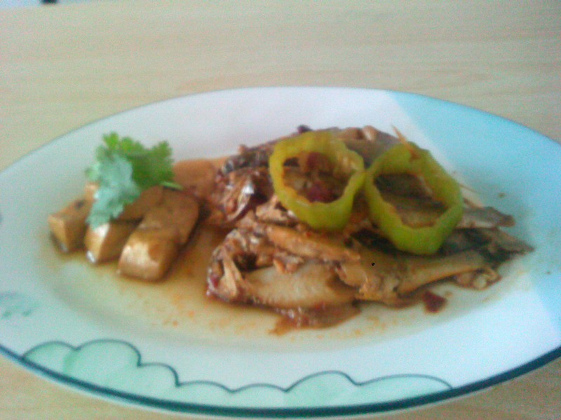 4、锅内放油,油温七成热时,放入葱姜蒜煸炒,待香味溢出时,再放入豆瓣酱和火锅料煸炒,火锅料化了之后加入凉水,凉水的量达到淹没6条小黄鱼的量,再依次加入酱油、鸡精、味精、糖,然后将小黄鱼和豆腐放入锅内,待煮熟后放入青椒段,出锅盛出。
