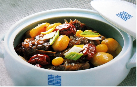 3、牛排煮熟,汤熬干一半时, 放入香菇.萝卜.栗子,再放剩余的1/2调味酱料并煮12分钟左右后, 放入胡萝卜续煮7分钟左右。 再放入红枣.银杏.松子,边淋上汤边煮3分钟左右。 肉汤汁几乎快要熬干时,将萝卜捞出来, 放入芝麻油均匀搅拌, 装碗再放上黄白蛋皮。