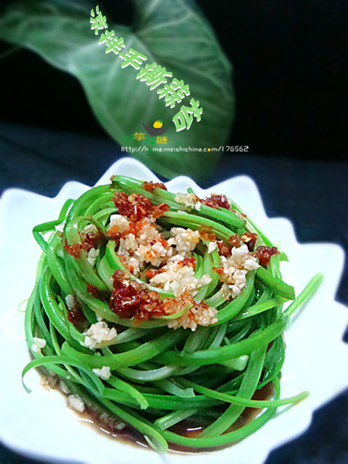 对美好的事物总有一种难以言喻的情愫,当看到这款菜的时候,就被它嫩绿的色彩,纤纤缕缕的造型深深吸引。 这是一道快手方便的凉拌菜,蒜苔经过热水短暂的汆制,少了生蒜苔独有的辛辣味,却依然保持着脆爽的口感。没有经过切割的痕迹,用原始手撕的方法,最大限度的保留了蒜苔的新鲜色泽和原汁原味。