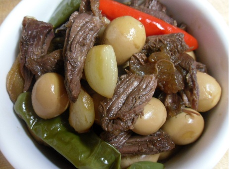 4、酱牛肉丝里放入蒜头, 煮10分钟左右后,放入酸浆辣椒, 续煮3分钟左右。 将肉撕成1cm厚后装碗, 在旁边放上蒜头与酸浆辣椒后,淋上酱油汤汁。