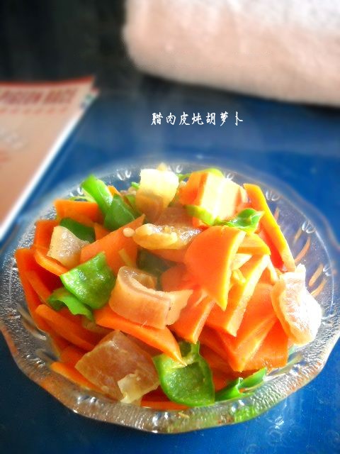 及以下步骤:加入少量冷水,煮10分钟。 倒入胡萝卜,加盐炒匀,煮3分钟。 加入青椒,调好味,断生即可装盘。 腊肉皮切小块,洗净;蒸米饭时一起蒸一会。 蒸好的腊肉皮再切小块。 锅中油热,下大蒜。 再倒入腊皮,炒匀。 加入少量冷水,煮10分钟。 倒入胡萝卜,加盐炒匀,煮3分钟。 加入青椒,调好味,断生即可装盘。