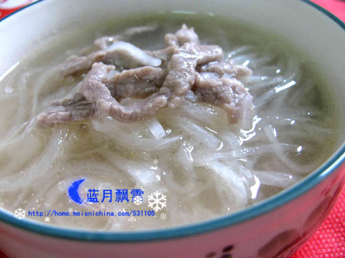 及以下步骤:牛肉丝中加入适量盐,鸡精,水淀粉拌匀。 锅中加少量油,放入姜蒜末炒香。 放入萝卜丝稍炒一下。 加入适量水,鸡精。 水开后放入牛肉丝,肉丝变色就熟了,加入盐 浇上一勺醋,起锅装入盘中即可。 来张成品图。 水开后放入牛肉丝,肉丝变色就熟了,加入盐 浇上一勺醋,起锅装入盘中即可。 来张成品图。