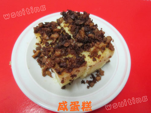 鸡蛋(6 粒) / 细白糖(1杯半) / 黑酱油(1 茶匙) / 发粉(1 茶匙) / 紅蔥酥(1 汤匙)