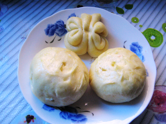 7、做了个蝴蝶型馒头,这是没馅的,女儿超高兴,也跟着学做呢。
