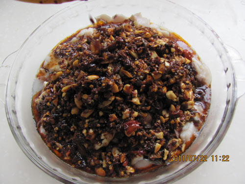 7、碗里放入生抽.老抽.白糖.盐.醋搅拌均匀,再把炸好的葱.姜.蒜.豆豉末到入,加辣椒油2大勺。