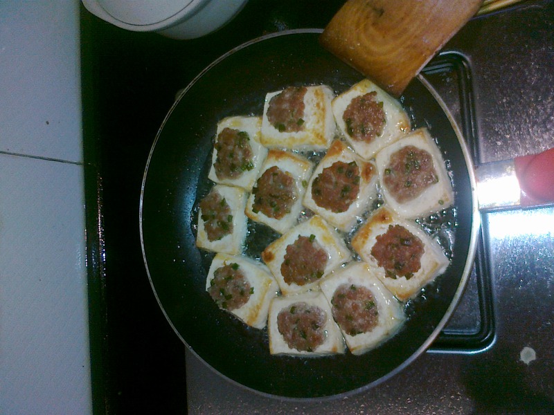 及以下步骤:继续小火煎豆腐的另外一面,差不多变成略带金黄色就行了! 往平底锅加点水,稍微煮一下,就可以装到盘子里上菜了呢! 嫩豆腐,一共切成12小块,正方形的哦! 葱剁碎之后和绞肉和一起,加一点生粉; 拿起小方块豆腐,从正面用筷子划个十字,前提是不要把豆腐弄烂了。。 将肉馅填进豆腐块儿里,以饱满为主咯! 填好之后平底锅热油,放鱼露,将豆腐有肉馅的那一边放在平底锅上; 小火慢慢煎~待你看到豆腐边边开始变黄就可以翻过来了; 继续小火煎豆腐的另外一面,差不多变成略带金黄色就行了! 往平底锅加点水,稍微煮一下,就可以装到盘子里上菜了呢!