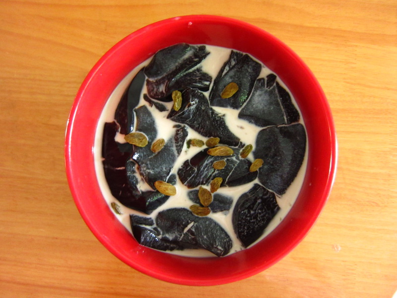 6、将仙草块放入小碗中倒入适量牛奶,加点炼乳,加点葡萄干即可。