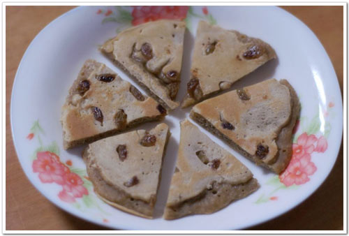 放入葡萄干后,饼边变干即可翻面了。有葡萄干那一面不要煎太久,因为葡萄干是甜的,容易焦哟~