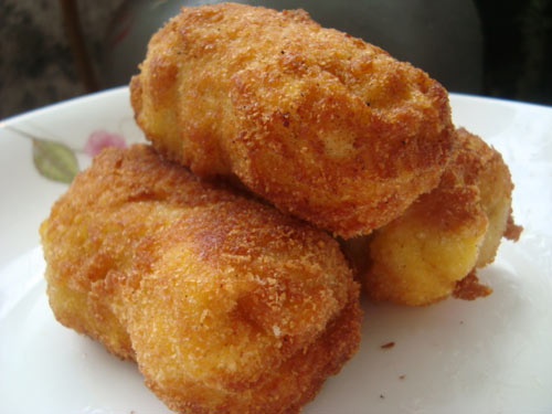 鸡脯肉(300克) / 面包糠(适量) / 鸡蛋(3个) / 面粉(100克) / 香蕉(2根)