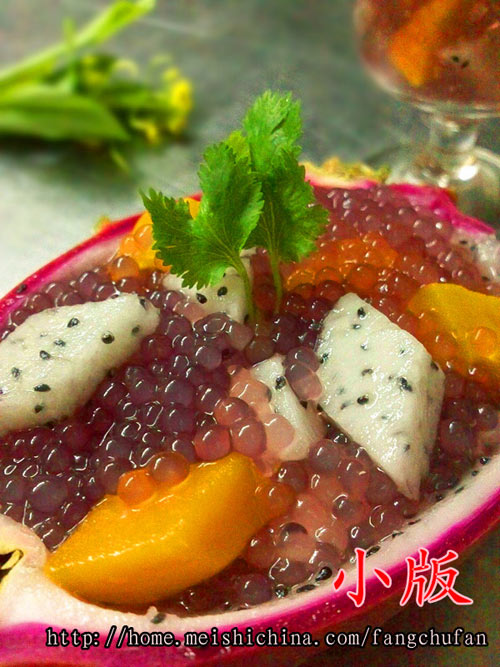 西米(适量) / 芒果(适量) / 火龙果(适量) / 蓝莓汁(适量)