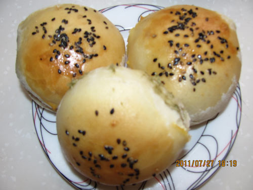 及以下步骤:第一次做的小面包.再接再励争取做的更好。 把发酵粉放入温水里,加白糖.盐.鸡蛋.搅拌均匀,然后加入面粉和成团发酵1--2小时,揉匀。 静置10分钟.揪成小剂子。 把发酵粉放入温水里,加白糖.盐.鸡蛋.搅拌均匀,然后加入面粉和成团发酵1--2小时,揉匀。 静置10分钟.揪成小剂子。 包上绿豆沙。 烤盘抹上油,放上包好的绿豆包发酵到2倍大。 刷上蛋液,撒上黑芝麻。 放入烤箱上下火200度25分钟就烤好了。 第一次做的小面包.再接再励争取做的更好。