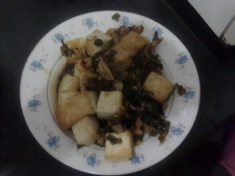 老妈本来想煎臭豆腐,我临时改变主意,就地取材,都是些冰箱存货如咸菜和肉块..
