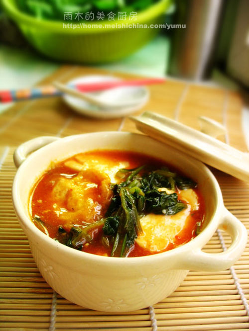 大夏天的,怎么想到驱寒了呢~有人会问,你没睡醒呢吧!呵呵~~我醒着呢哦!虽然是夏天,而且是气温30度以上的天。从小生长在北方的我,感觉近几年来,季节变化与小时候真是区别好大的。记得小时候,冬天特别冷,雪下的也特别大。上小学时,遇到雪天,走路时会踩出很深的印呢,真是要数着步走的。那时候穿的也多,大厚棉衣,棉裤,记得有几年特流行穿军大衣,也不是为了好看,那真暖和啊~夏天也没现在热。 现在的冬天,感觉真是很暖和。基本不用穿棉的了,一条毛裤就可以过冬的。一个冬天里,雪下的也比较少,偶尔见到飘雪了,会感到很兴奋!夏天变的很糟,每年5月开始,气温开始上升,随之而来的,就是稀稀啦啦的小雨下个不停。等入了伏,雨就更多了。今年,还来了几次特大暴雨,挺吓人的。碰上个好天,没雨了,那就来个暴晒,热的让人发狂。在哪待着都不舒服! 老公说,现在的北方越来越像南方了,阴雨天多。好像真是呢~特别是前些天,一连下了好几天,气温还是很高的,让人感觉更是发焖,透不过气。这样的天,晚上更难过,睡觉吧,盖被子热,不盖被子,下半夜,还有点凉,加上外面一直下着雨,感觉身体湿气重,特容易生病。 这个汤有点模仿狗肉豆腐汤。原来住的地方楼下就是一家冷面店,冬天时,他家就有狗肉豆腐汤。冬天时,常和老公去的,一碗汤,两碗米饭。辣辣的,暖暖的,吃完了,心里暖乎乎的。原汤里有豆腐,有狗肉汤(没有肉哦),加上雪里红,还有辣酱。我找了一下,这几样,家里只有豆腐,还是做糯米团子剩下的。其它的都没有。对还有半碗鸭油,做烤鸭翅剩下的,做法见先微后烤更健康【双浴鸭翅根】。 说说这个汤的做用吧,本来是有些不舒服,下雨了,我还睡了凉席,受了点凉!怀疑要感冒,就想到这个汤。效果呢???真的很明显吧,吃的时候,就辣的直出汗,饭后,就感觉好像真是赶着寒气往下跑呢~这下好,舒服多了~呵呵