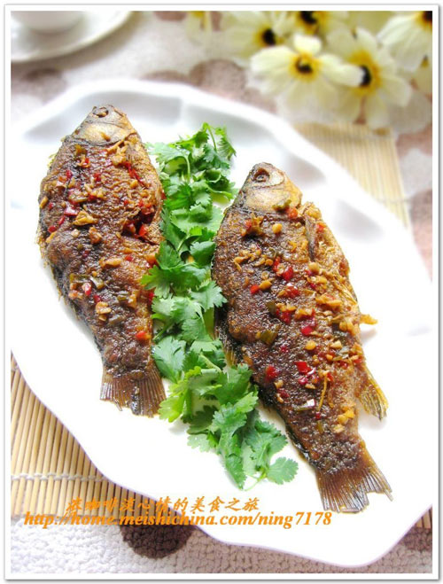 鲫鱼最好选用个头稍微小一点的,便于将鱼刺炸酥,成菜口感才好.炸鱼的油温不可过高,油温要控制在能将鱼刺炸酥而表面又不焦糊为宜.