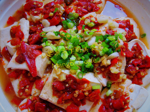 及以下步骤:盖上密封盖,放入冰箱,浸泡24小时以上~ 我是48小时以后才开的封,那个臭,我是没敢在人都在家的时候弄~_~ 将腌制好的臭豆腐摆盘,上面均匀地铺上3大勺红翻天剁辣椒。 锅内烧水沸腾后,放入臭豆腐,隔水用大火蒸7分钟之后起锅,散上葱花 糖,吃得不让人停嘴!! 倒入绍兴米酒(老爹说应该用黄酒,可惜我只买得到米酒!) 放入50g的花椒 再加入6块王致和臭豆腐乳,搅碎并倒入臭豆腐乳汁 把切好的豆腐块浸入汤汁中 盖上密封盖,放入冰箱,浸泡24小时以上~ 我是48小时以后才开的封,那个臭,我是没敢在人都在家的时候弄~_~ 将腌制好的臭豆腐摆盘,上面均匀地铺上3大勺红翻天剁辣椒。 锅内烧水沸腾后,放入臭豆腐,隔水用大火蒸7分钟之后起锅,散上葱花 糖,吃得不让人停嘴!!