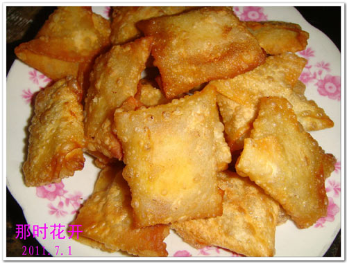 一定要注意火候,基本上一放入油锅就要翻面,很快就炸好了。本来是想裹鸡蛋液炸的,实践证明没那个必要。包好直接炸简单,五角钱的馄饨皮炸了这么一大盘。