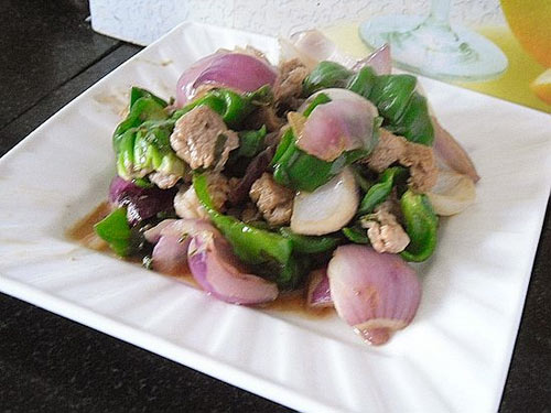 7、放入青椒、洋葱。大火快速翻炒均匀。