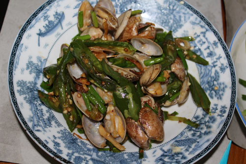6、然后倒入控干水分的花蛤翻炒2-3分钟。