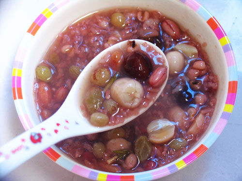 花生米(一小把) / 葡萄干(一小把) / 莲子(十几粒) / 阿胶枣(十几枚) / 红小豆(一小把) / 薏米仁(一小把) / 红芸豆(一小把) / 圆江米(一小把) / 奶芸豆(一小把)