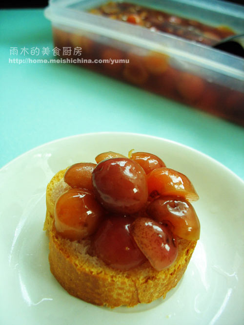 及以下步骤:樱桃用刀切开去核。 樱桃洗净,普通的白酒就行。 樱桃用刀切开去核。 樱桃洗净,普通的白酒就行。 樱桃用刀切开去核。 樱桃洗净,普通的白酒就行。 樱桃用刀切开去核。 用水来煮樱桃,煮开后,加入糖,再加2勺左右的白酒。 再次煮开,关火;稍凉,将其放入有盖的保鲜盒,冰箱冷藏一夜。 把法混切成2厘米厚片。浇上樱桃汁,让法棍刚好吸满,上面再放几颗樱桃肉。