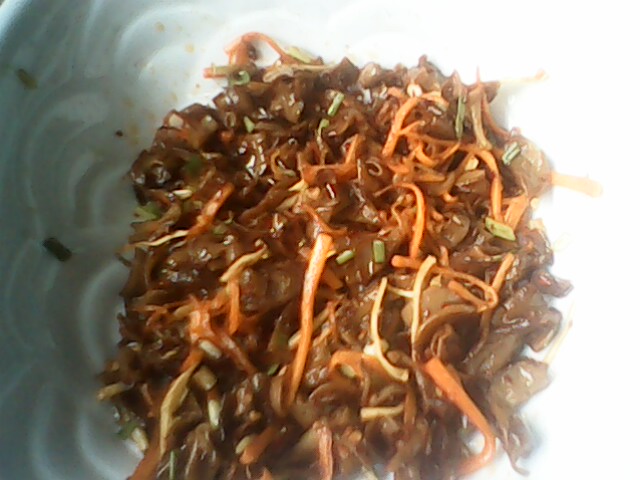 4、然后将在锅子一边的胡萝卜丝和卤牛肠子一起炒,再加入辣椒粉,姜末,