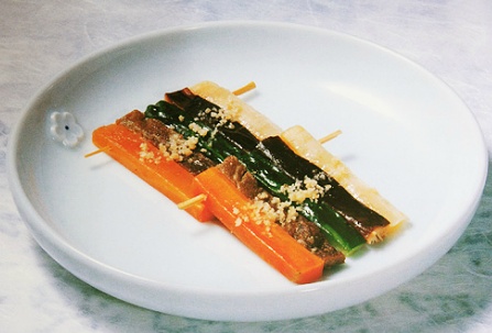 蔬菜串肉是将牛肉和桔梗,香菇,胡萝卜,黄瓜,鸡蛋等五色材料一起调味弄熟,穿在串儿上煎成的美食。蔬菜肉串像花朵一样华丽多彩,在朝鲜时代多用于宫廷的宴会。就着少量的材料,汇集了肉,鱼,鸡,蔬菜等各个种类的食品,是原来必备的聘礼和饭桌上常见的菜肴。