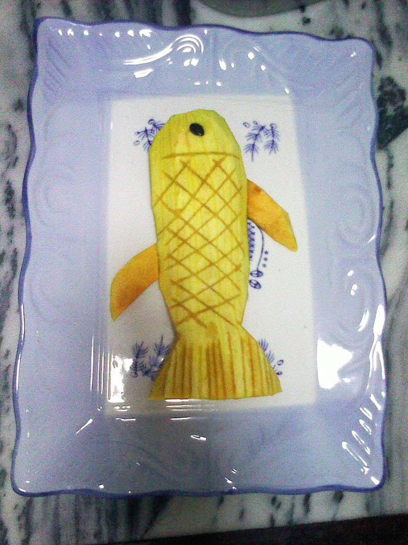 及以下步骤:切出一块南瓜,去籽,洗净。 先切出鱼的外型,再用刀画出鱼鳞,打十字就好,还有鱼尾。在做出两条鱼鳍,然后点上豆鼓做鱼眼睛。 切出一块南瓜,去籽,洗净。 先切出鱼的外型,再用刀画出鱼鳞,打十字就好,还有鱼尾。在做出两条鱼鳍,然后点上豆鼓做鱼眼睛。 切出一块南瓜,去籽,洗净。 先切出鱼的外型,再用刀画出鱼鳞,打十字就好,还有鱼尾。在做出两条鱼鳍,然后点上豆鼓做鱼眼睛。 切出一块南瓜,去籽,洗净。 先切出鱼的外型,再用刀画出鱼鳞,打十字就好,还有鱼尾。在做出两条鱼鳍,然后点上豆鼓做鱼眼睛。 然后上锅蒸15分钟。 蒸好了,换个漂亮的四方碟。
